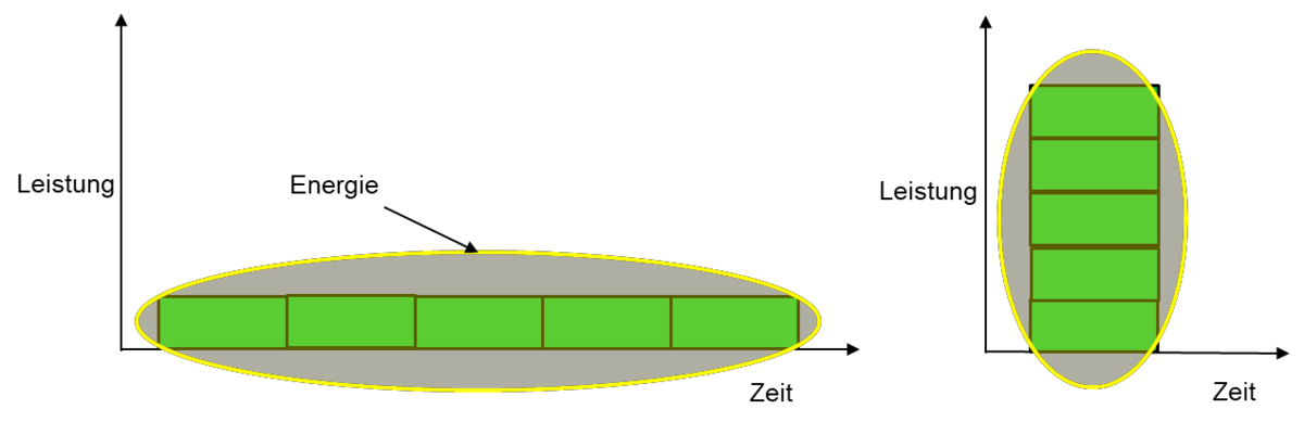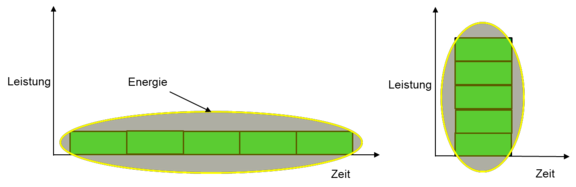 Trägt man 5 Kisten in 5 Minuten in den Keller, so wurde Arbeit verrichtet und Energie verbraucht. Die gleiche Energiemenge muss man aufbringen, um alle Kisten in 1 Minute in den Keller zu tragen. Allerdings hat man dann eine deutlich höhere Leistung aufgewandt.
