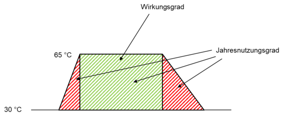 Folgendes Beispiel verdeutlicht den Zusammenhang. Im Sommer hat der Kessel aufgrund des geringen Heizbedarfs eine niedrige Temperatur von beispielsweise 30°C. Für den Warmwasserbedarf muss er in zeitlichen Abständen allerdings auf 65 °C (aus hygienischen Gründen) aufheizen. Der Kessel heizt sich dann erst einmal auf, bis er die 65 °C erreicht hat. Erst dann kann die Wärme genutzt werden. Diese Energie (rote Bereiche) kann im System nicht genutzt werden und wird als Aufheiz- bzw. Abkühlverluste bezeichnet.